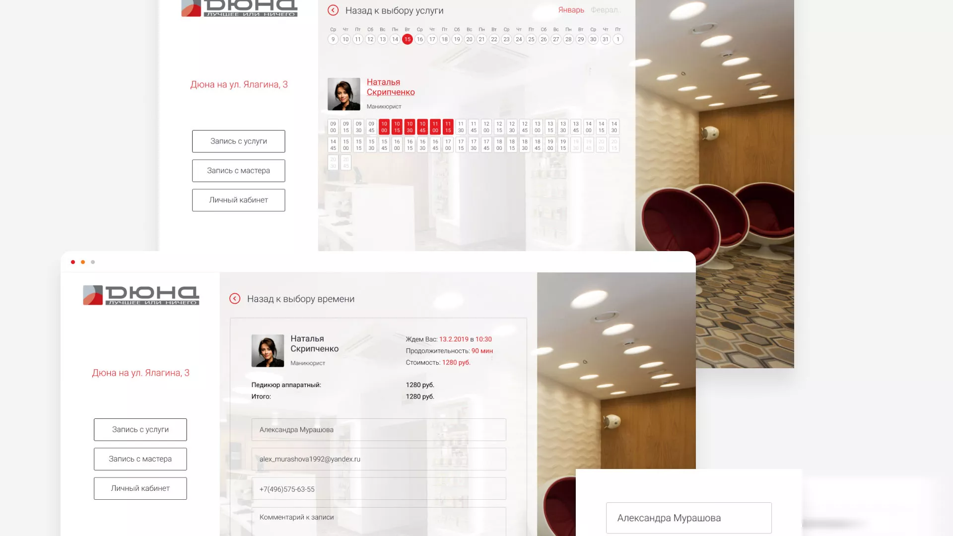 В разделе «Личный кабинет» содержатся все текущие записи в салоны красоты в Туапсе, с возможностью их отмены. Также, здесь можно редактировать свои персональные данные, ознакомиться с историей записей и видеть бонусы и акции салонов красоты.